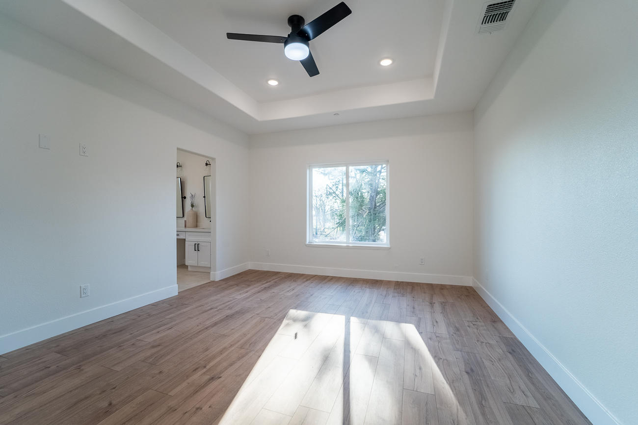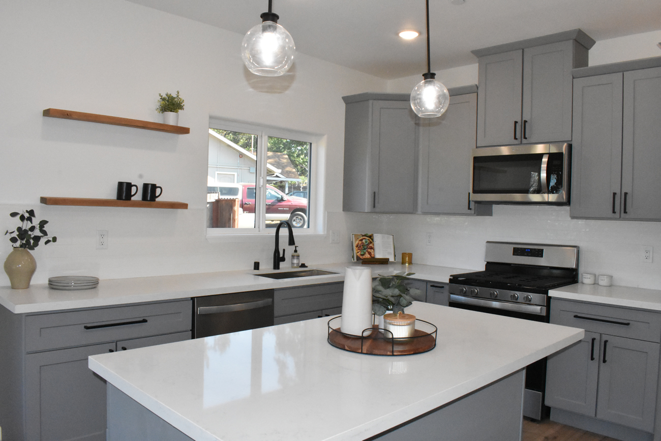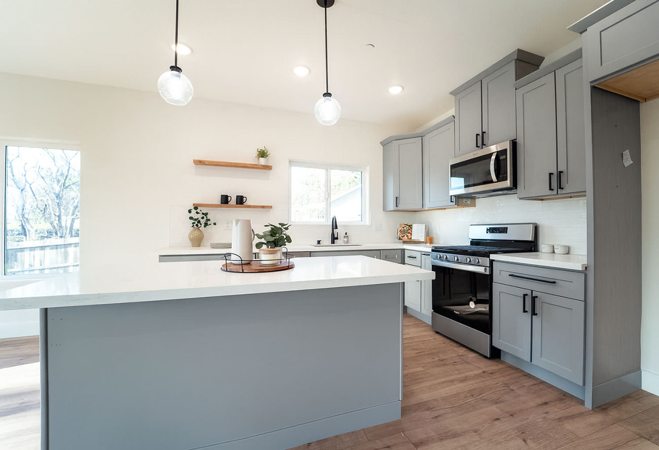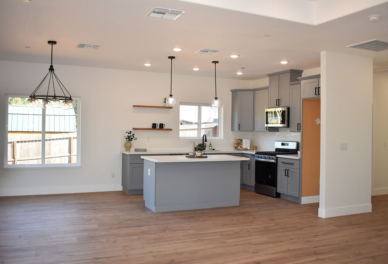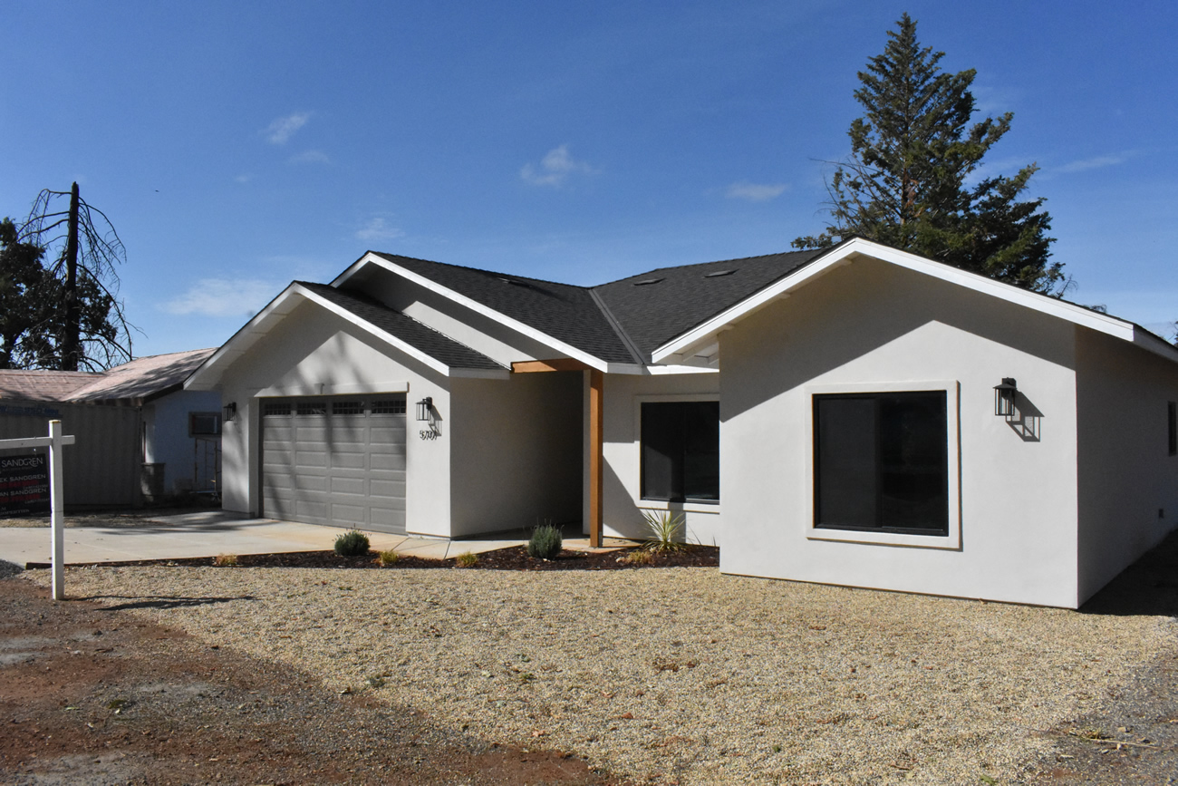 This new construction home in Paradise was built as part of the community’s ongoing recovery after the Camp Fire. Designed on a budget without sacrificing quality, the home features an open floor plan with three bedrooms, two bathrooms, and an oversized garage on a half‑acre lot. The open layout emphasizes comfort and efficiency.